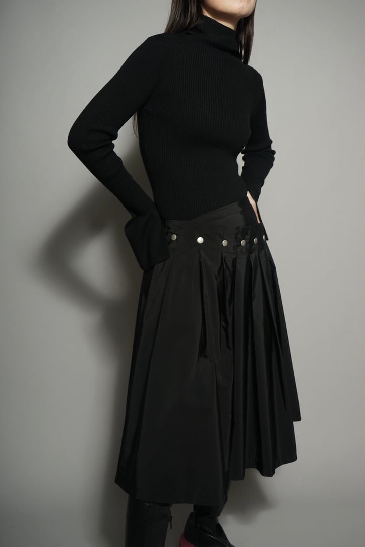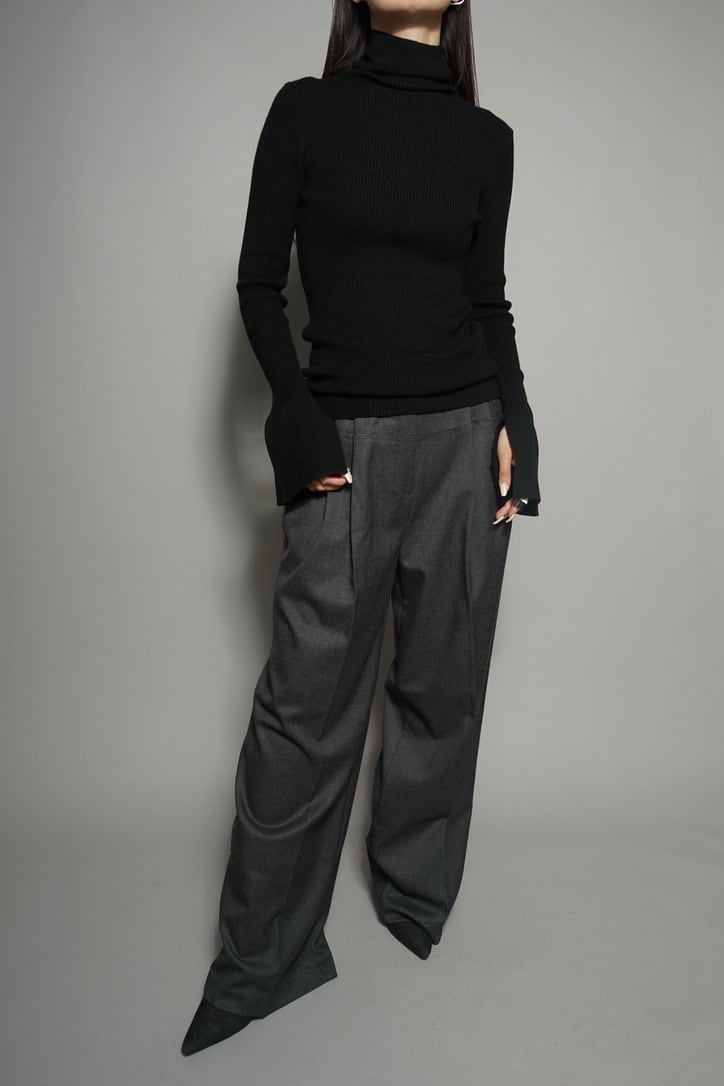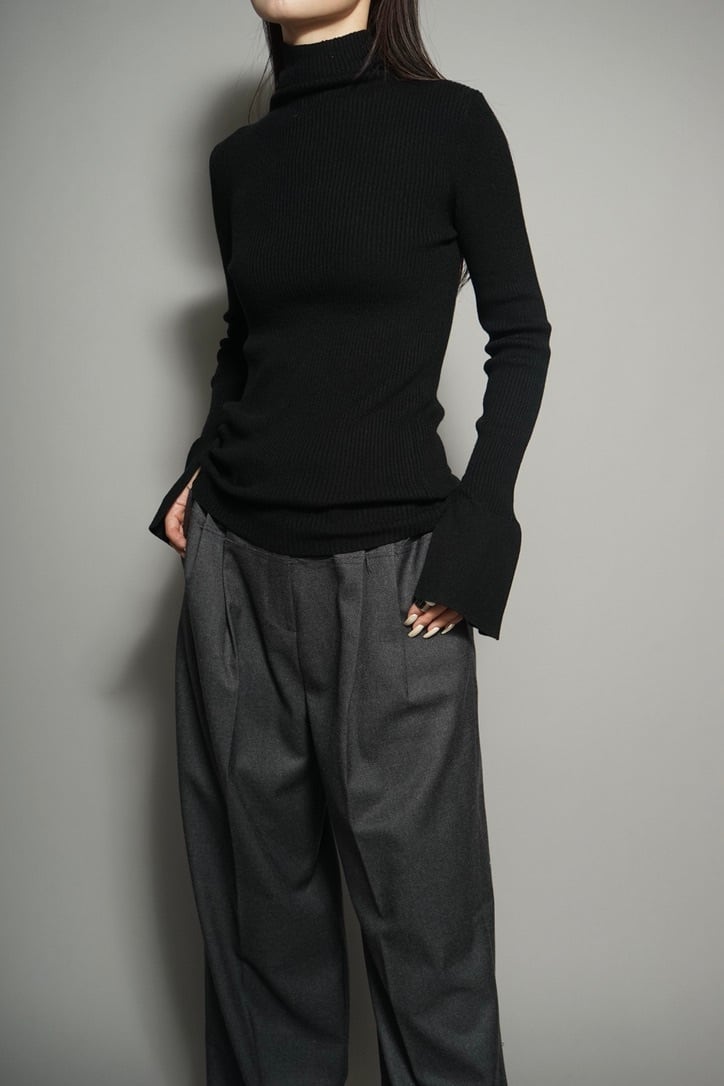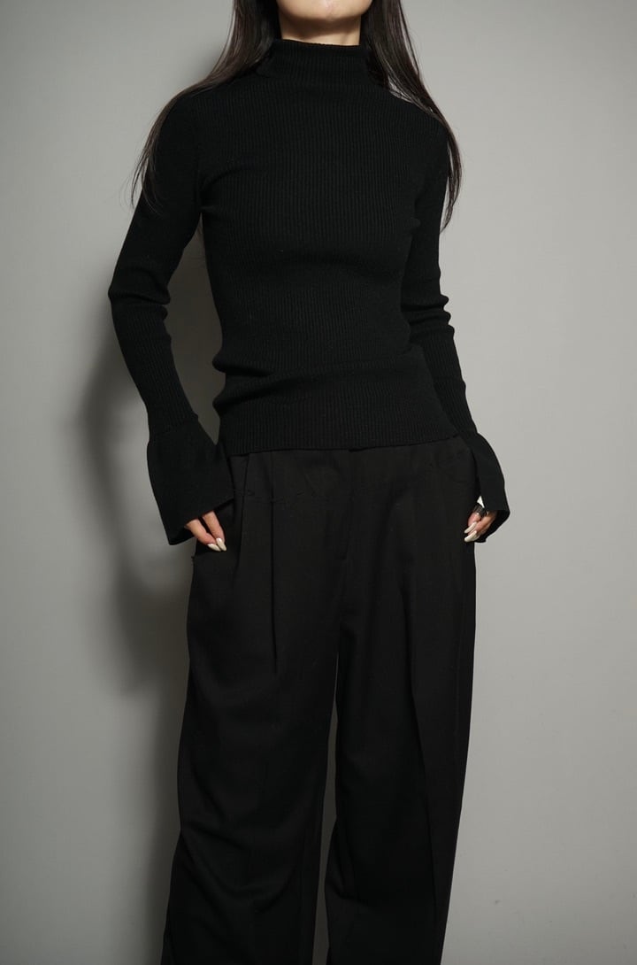 スリットが入ったベルスリーブのハイネックニットトップス。