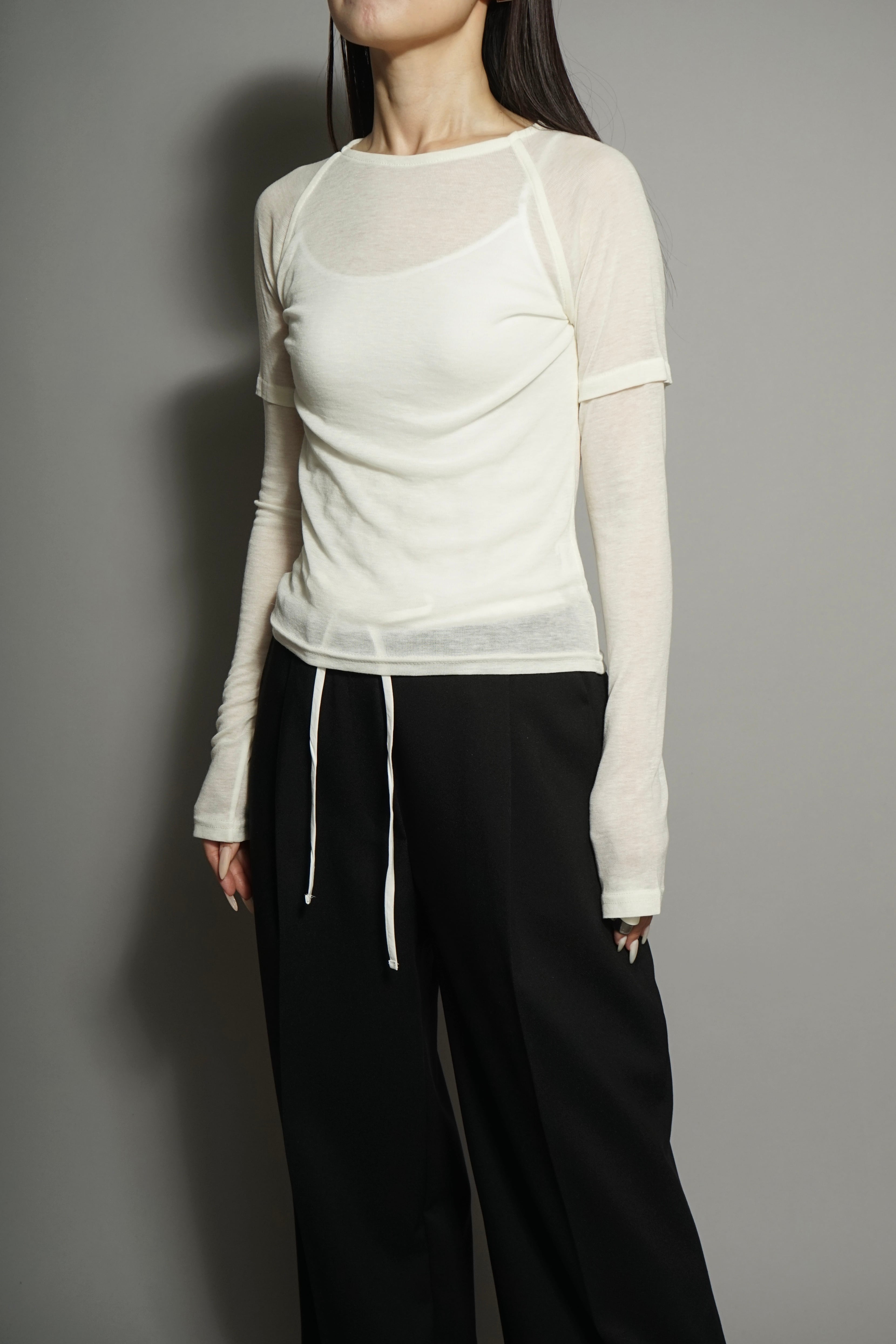 シースルー素材のレイヤードスリーブトップス。