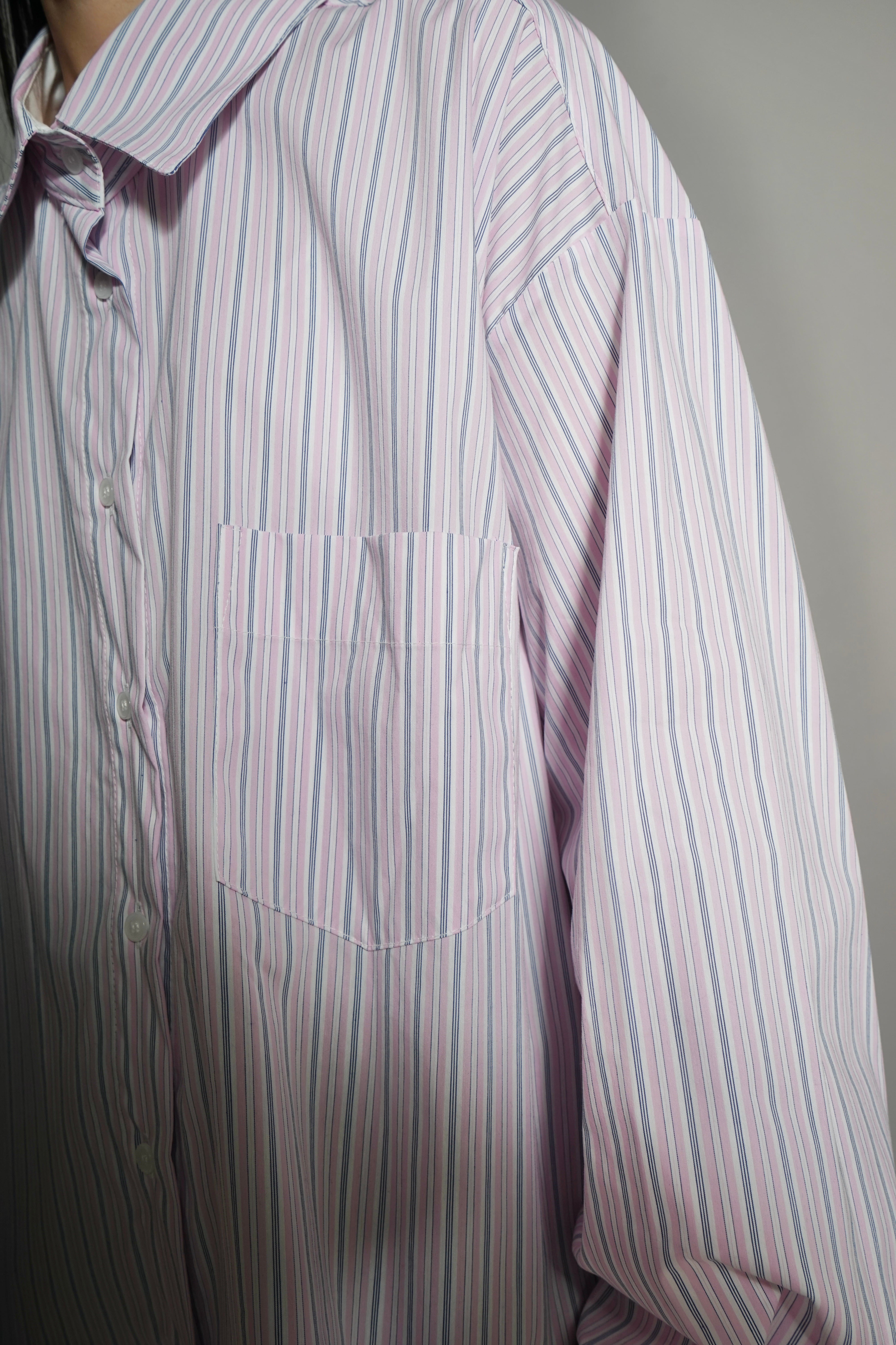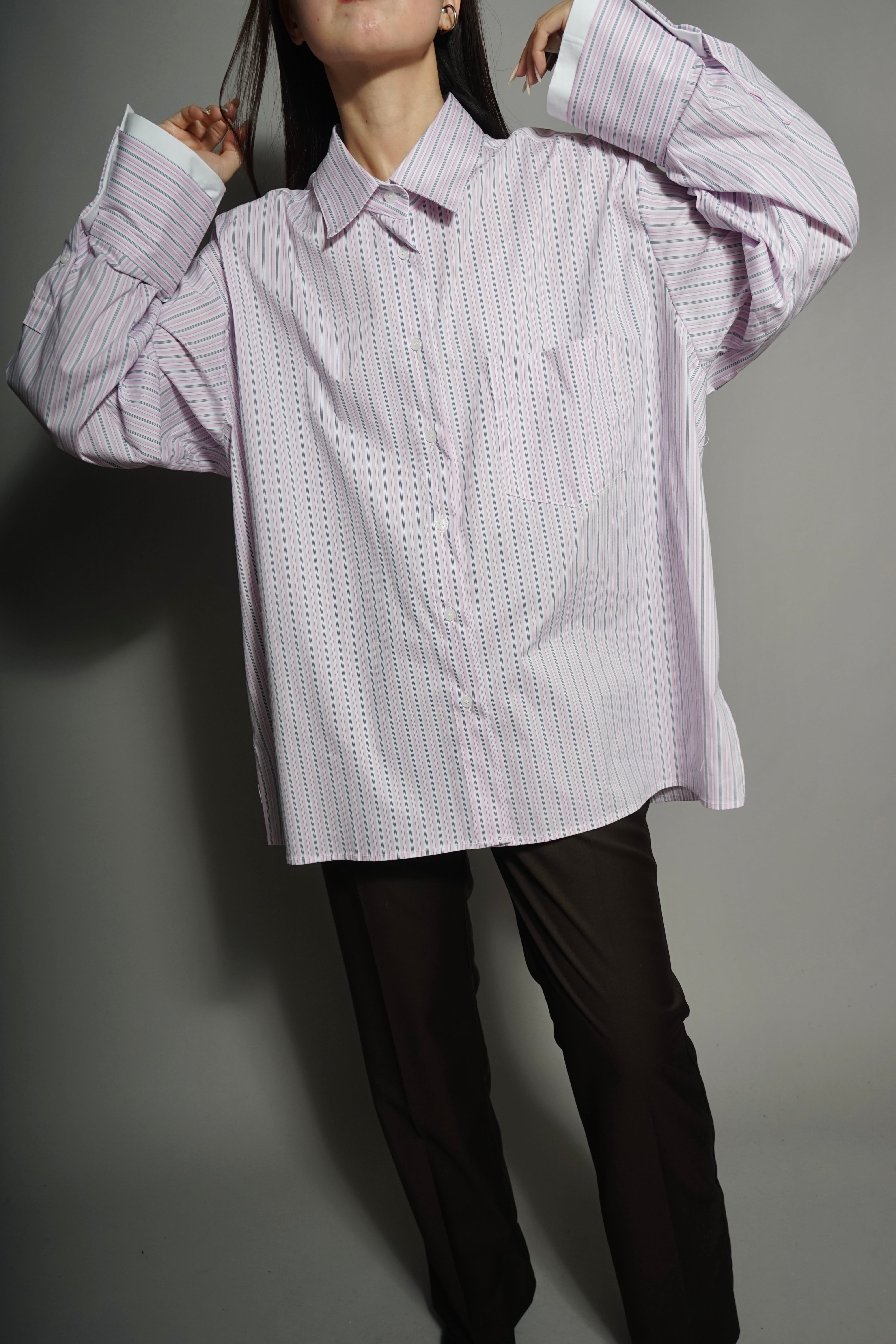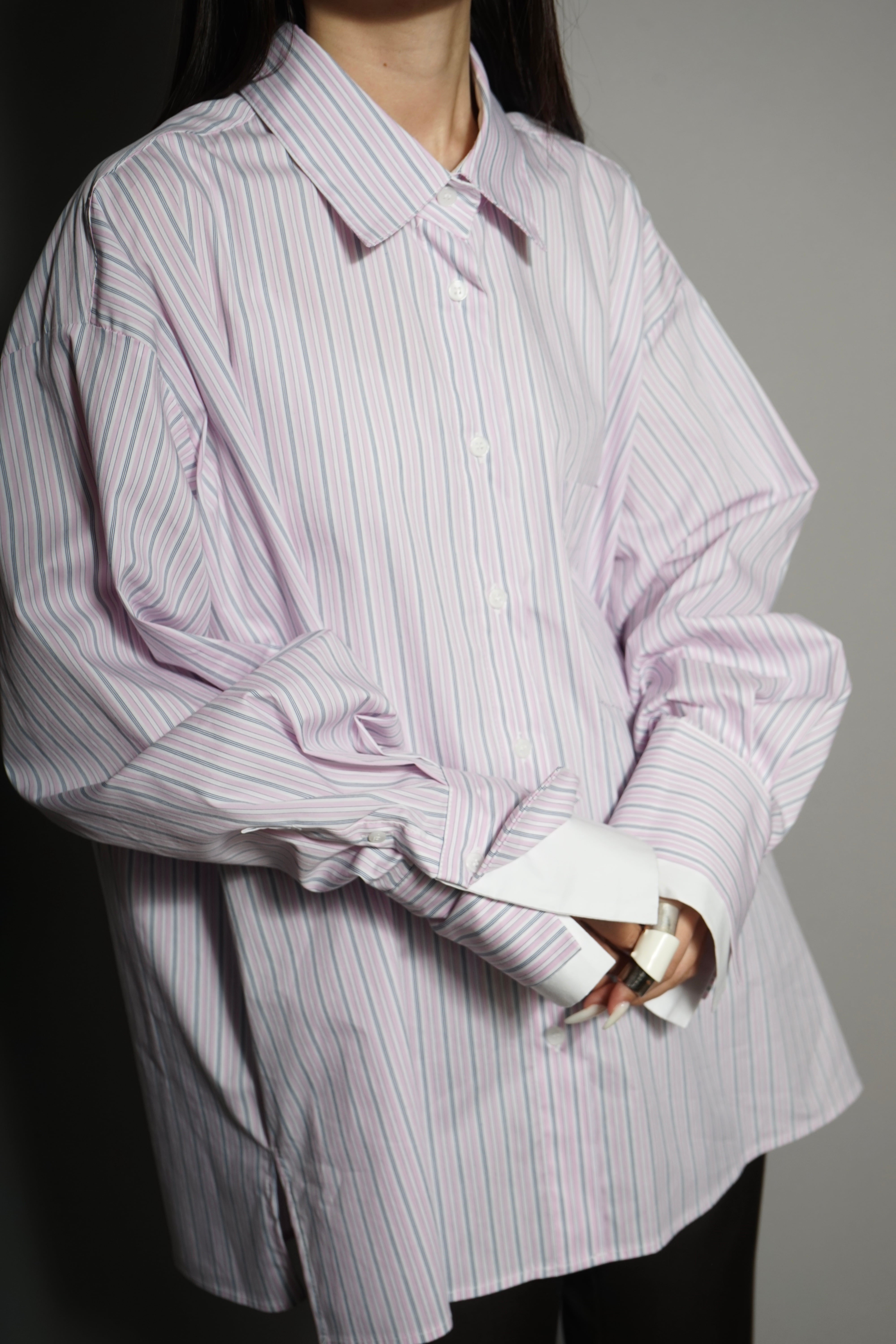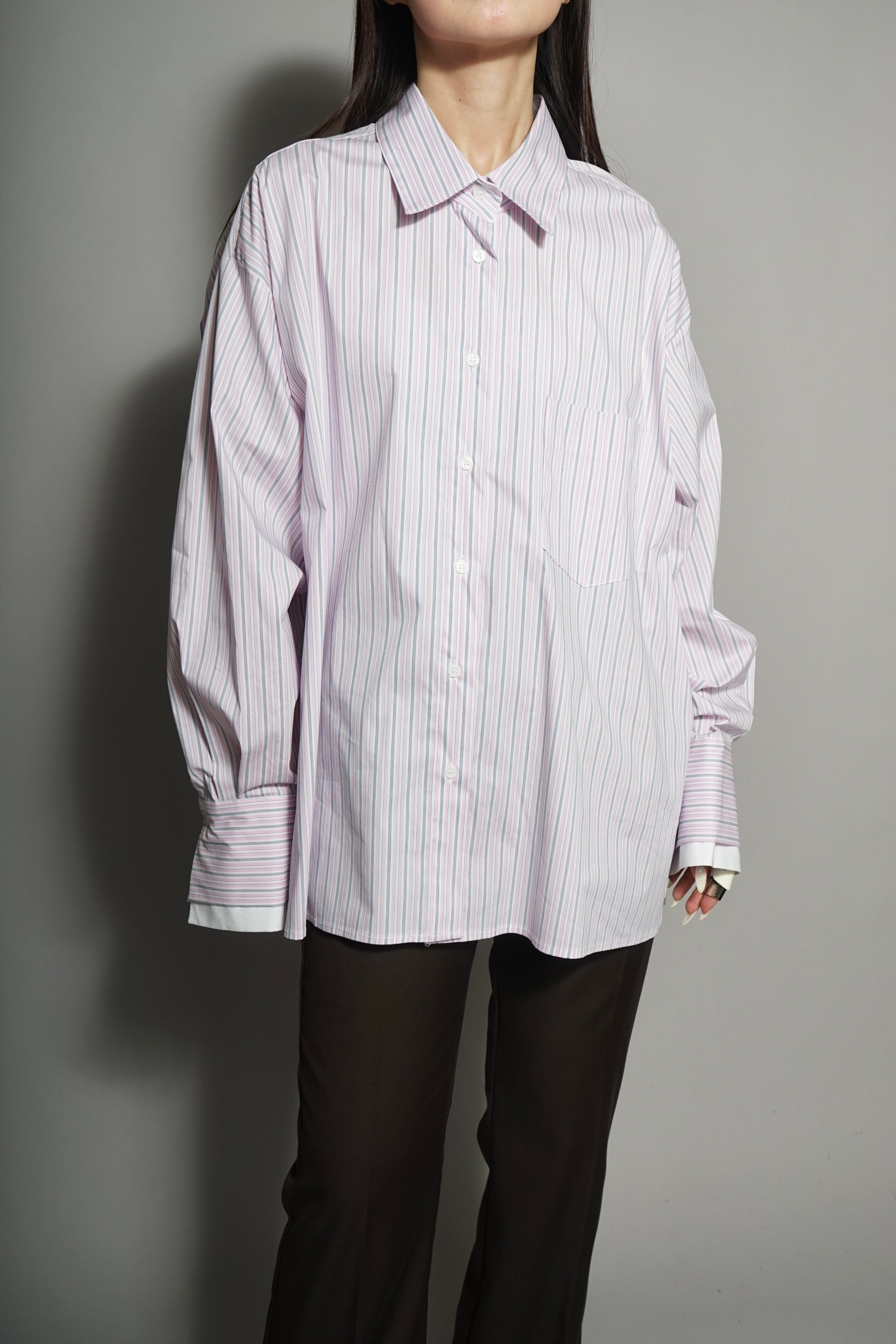 高密度の張り感が特徴のストライプ素材を用いて、袖口をホワイトのポプリン素材で切り替えたレイヤードカフスシャツ。