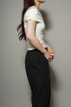 コットンストレッチ素材を使用した、伸縮性の高い滑らからなフィット感のオフショルダートップス。