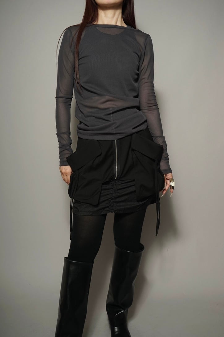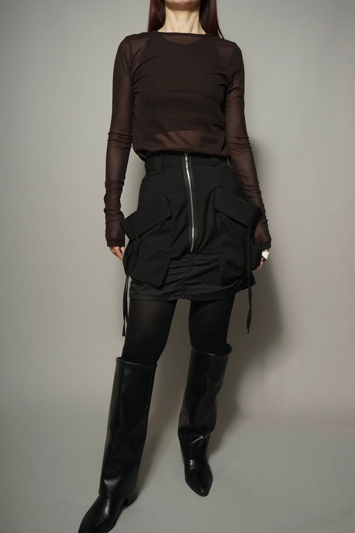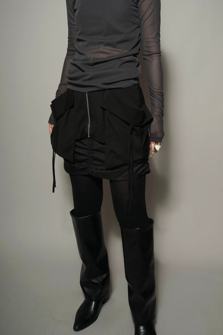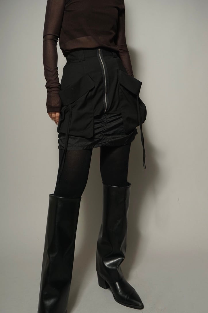 サージストラップ素材を用いてヘムラインに軽量ナイロンを重ねたレイヤードミニスカート。